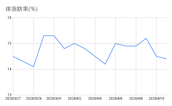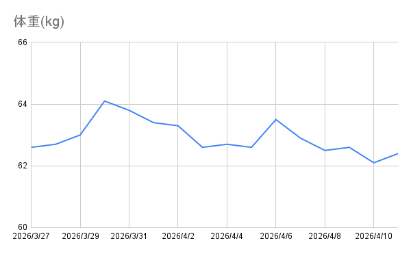 | 4/10(金) | 62.1 kg | 14.5 % |